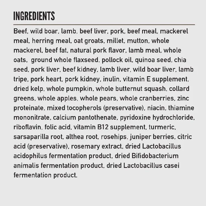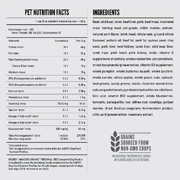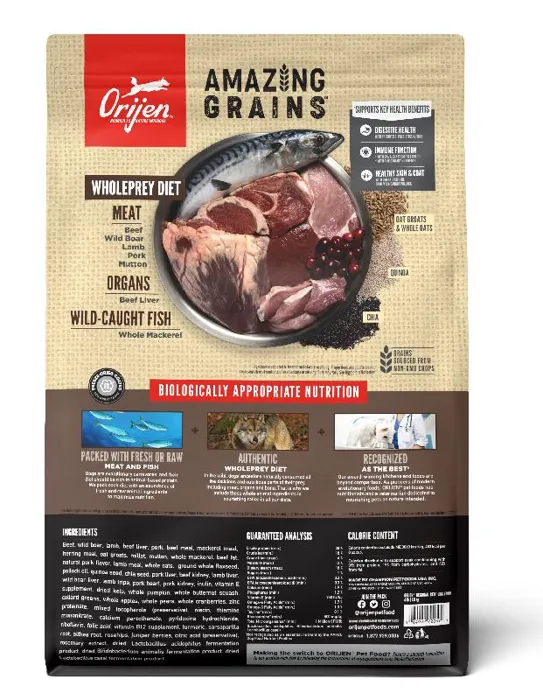 ORIJEN Amazing Grains is packed with fresh or raw animal protein and enhanced with hand-selected grains to give your dog peak nourishment. With 90%* premium animal ingredients, ORIJEN Regional Red with Amazing Grains includes WholePrey ingredients from beef, wild boar, goat, lamb and wild-caught mackerel. These nutrient-dense animal ingredients provide your dog with the protein, vitamins and minerals they need to thrive. This diet includes only the most amazing grains in a high-quality blend of oats, quinoa and chia and more, hand-selected to provide a balanced fiber ratio that helps support your dog’s digestive health.