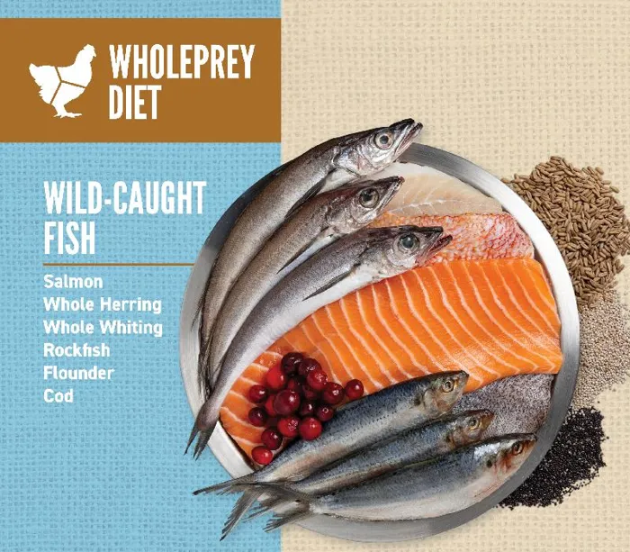 - Authentic WholePrey diet features the most succulent parts of the prey like fish, organs and bone to mimic what your dog’s ancestors consumed in the wild.