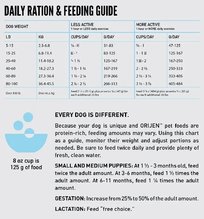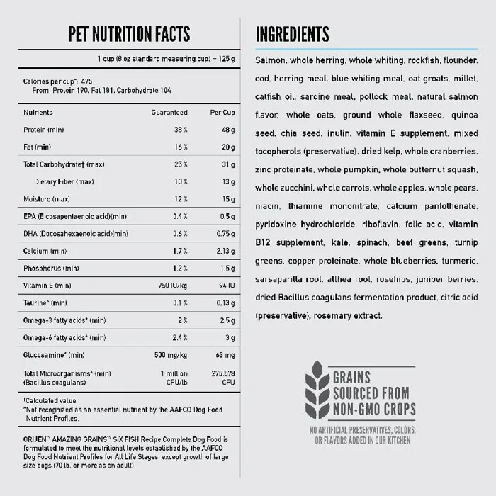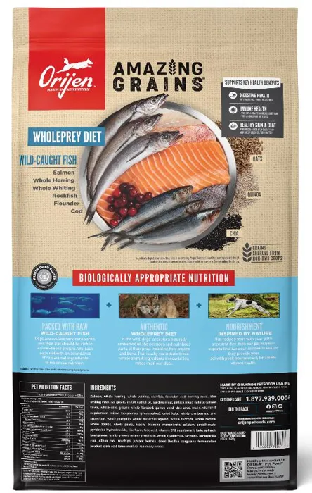 ORIJEN Amazing Grains is packed with fresh or raw animal protein and enhanced with hand-selected grains to give your dog peak nourishment. With 90%* premium animal ingredients, ORIJEN Six Fish with Amazing Grains includes WholePrey ingredients from wild-caught whole mackerel, whole herring, monkfish, acadian redfish, flounder and whole hake. These nutrient-dense fish ingredients provide your dog with the protein, vitamins and minerals they need to thrive. This diet includes only the most amazing grains in a high-quality blend of oats, quinoa and chia and more, hand-selected to provide a balanced fiber ratio that helps support your dog’s digestive health.