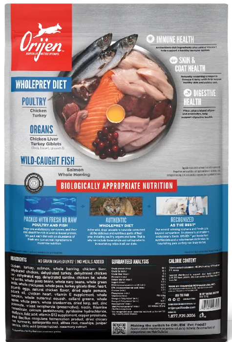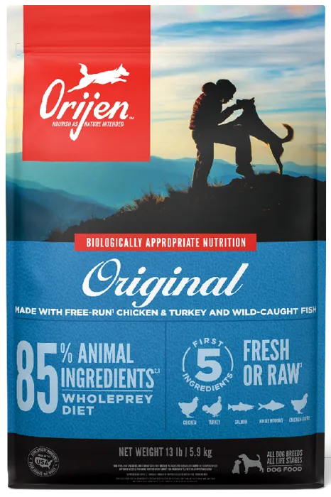 Dogs are ancestral carnivores, so their Biologically Appropriate diet is rich and varied in whole animal ingredients. ORIJEN® Original recipe is packed with 85%* quality animal ingredients fresh or raw+ like free-run chicken and turkey**, and wild-caught fish. With rich inclusions of Wholeprey animals, ORIJEN dog food is made with the most nutrient-dense, succulent parts of the prey to deliver the nutrition dogs need. The result is a diet for your canine companion that is beyond comparison.