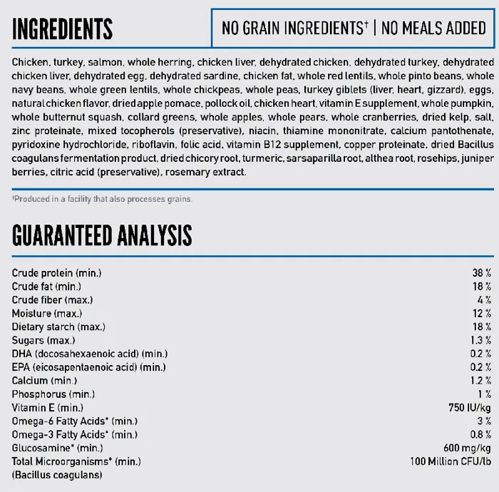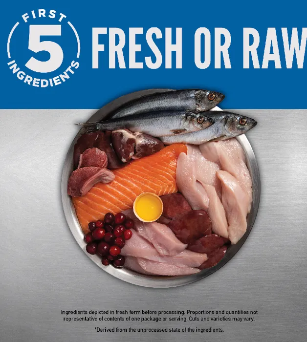 - Offers a rich diversity of fresh and raw meats; 85% meat inclusions, 15% veggies & fruits, and 0% grain, tapioca, or plant protein concentrates
