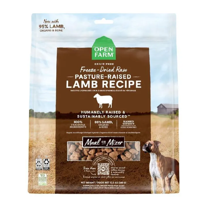 Easy to serve and easy to please. This high protein topper or complete meal is packed with humanely and pasture-raised lamb. For added nutrition Open Farm combines it with functional ingredients like locally sourced leafy greens, squash and pumpkin seeds, superfoods like coconut oil, and antioxidants like blueberries.