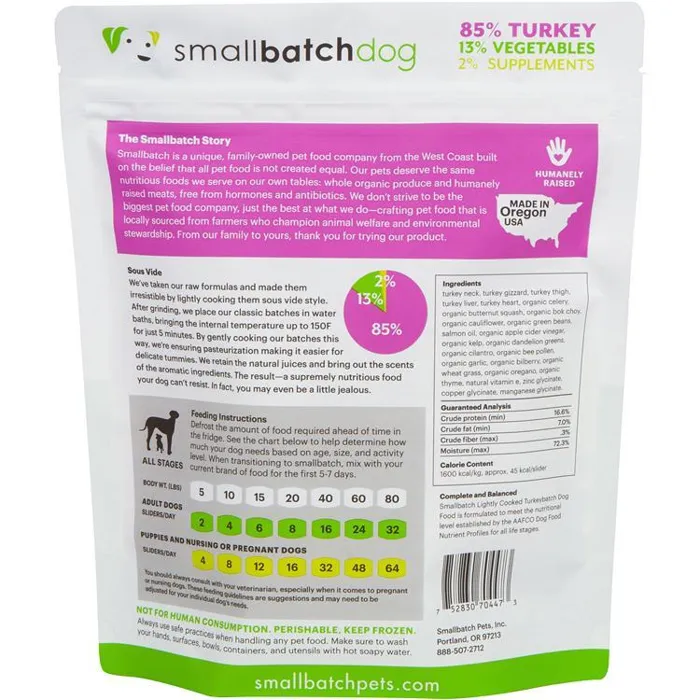 Our same pristine smallbatch ingredients, combined in a dog formula and gently cooked sous vide style. We place our classic batches in water baths, bringing the internal temperature up to 150F for just 5 minutes. By gently cooking our batches this way, we’re ensuring pasteurization making it easier for delicate tummies. Optimal nutrition in a slider, ideal for sensitive systems.