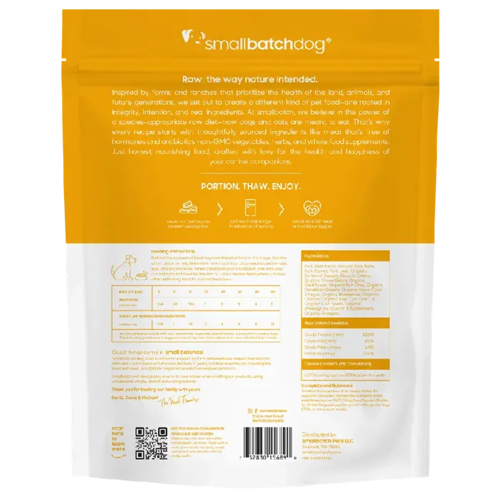 Only made with the highest quality organic non-GMO ingredients for the freshest and most nutritious raw meals that your pet will love! Smallbatch's raw diets use a limited-ingredient single-protein formula featuring 78-88% meat, organ and bone. Only made with meat that is humanely USA-sourced and antibiotic and hormone-free. Smallbatch proudly features no mechanically separated meat. All essential vitamins, minerals, and amino acids come from organic wholefood sources. Features convenient individual sliders for easy feeding and portion control! Your dog will be licking their lips after tasting theses delicious raw diets! No Root Vegetables. Made in USA. Smallbatch is a trusted family-owned company that is proudly hand-chosen by the Pet Beastro!