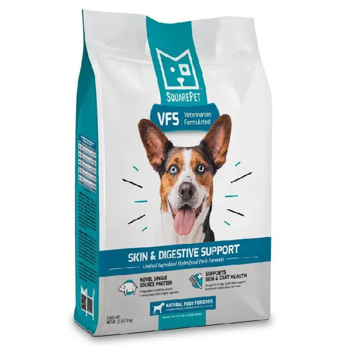 SquarePet® VFS Skin & Digestive Support formula has been designed by SquarePet’s team of veterinary professionals to support food sensitivities/ingredient intolerances. VFS Skin & Digestive Support formula for dogs is a unique, limited ingredient, hydrolyzed protein dog food. Similar to proteins used in some infant formulas, hydrolyzed proteins are proteins that have been broken down into smaller components. The result is an exceptionally digestible protein source that can be beneficial for dogs that may be sensitive to common pet food ingredients.