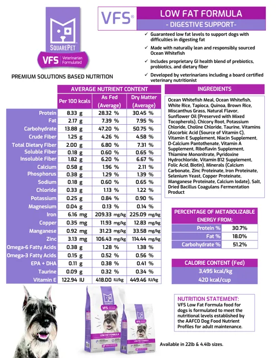 SquarePet® VFS® Low Fat Formula has been developed by SquarePet’s team of veterinary professionals to support digestive health. VFS® Low Fat Formula is made with naturally lean Ocean Whitefish to create a highly palatable and easily digestible low fat dog food.