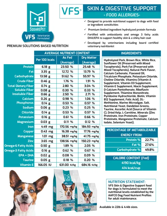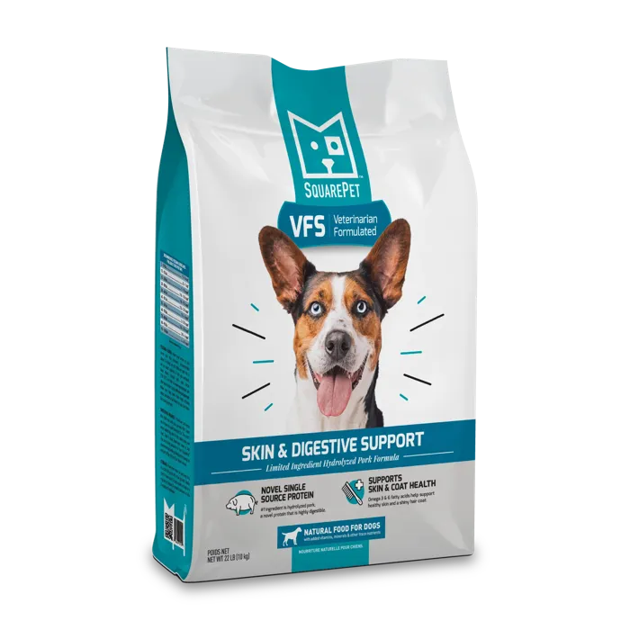 SquarePet® VFS Skin & Digestive Support formula has been designed by SquarePet’s team of veterinary professionals to support food sensitivities/ingredient intolerances. VFS Skin & Digestive Support formula for dogs is a unique, limited ingredient, hydrolyzed protein dog food. Similar to proteins used in some infant formulas, hydrolyzed proteins are proteins that have been broken down into smaller components. The result is an exceptionally digestible protein source that can be beneficial for dogs that may be sensitive to common pet food ingredients.