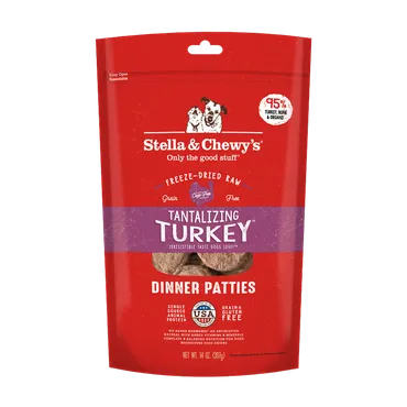 Kickstart Your Kibble! Dogs naturally crave meat, much like they ate in the wild. That's why every batch of Tantalizing Turkey Meal Mixers starts with 95% cage-free turkey, organs and bone plus 100% organic certified fruits and vegetables to guarantee your pet is eating as nature intended. Every recipe from Stella & Chewy's is grain-free and minimally processed. All ingredients are sustainably sourced, and NEVER from China. Add a scoop to your dog's kibble for a boost of real freeze-dried raw food nutrition and taste