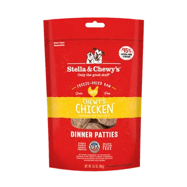 Only the Good Stuff! Dogs naturally crave meat, much like they ate in the wild. That's why every batch of Chewy's Chicken Dinner Patties starts with 95% chicken (always cage-free), organs and bone plus 100% organic certified fruits and vegetables to guarantee your pet is eating as nature intended. Every recipe from Stella & Chewy's is grain-free and minimally processed. All ingredients are sustainably sourced, and NEVER from China.