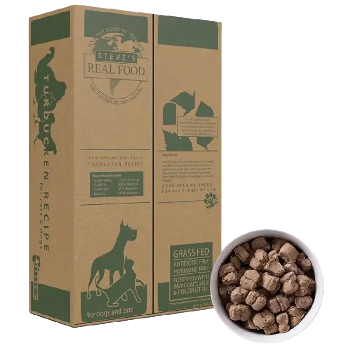 Steve’s Real Food frozen turducken raw pet food blends the flavors and nutrients of turkey, duck, and chicken, offering a delectable medley of poultry meats for your pet to enjoy. It’s a highly palatable raw recipe that has wide-ranging nutritional benefits. It is made from organic, free-range poultry. Turducken is complete and balanced for all stages of life, and is species-appropriate for dogs and cats. The turducken recipe is a BARF formulation composed of 80% meat/organ/bone, 15% produce, and 5% value-added ingredients such as New Zealand Green Lipped Mussel, coconut oil, and raw goat milk