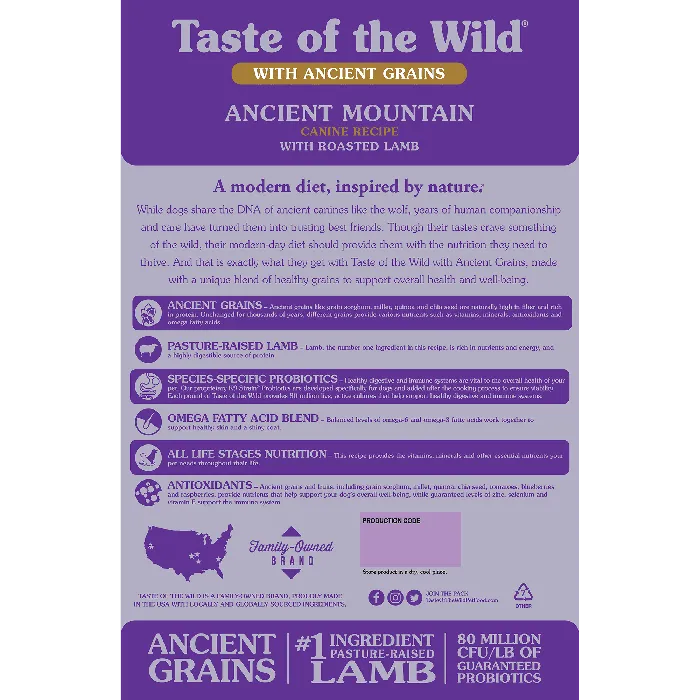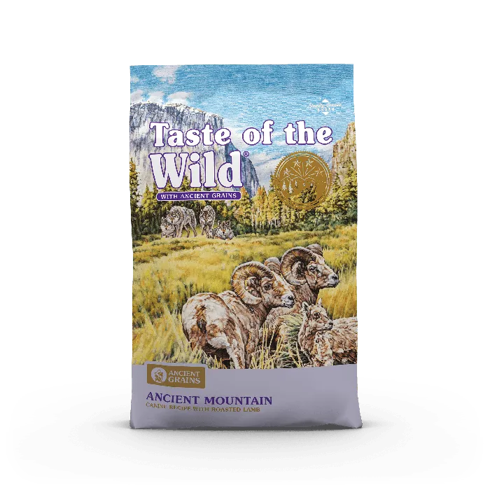 Feed your canine companion a balanced diet with ingredients straight from nature with Taste of the Wild Ancient Mountain Roasted Lamb & Ancient Grain Recipe Dry Dog Food! It features real pasture-raised lamb as the number one ingredient, which not only offers your pup a source of highly digestible protein, but also the nutrients and energy he needs. This recipe is crafted with a combination of whole grains like millet, quinoa, chia seed and sorghum to support your sidekick’s overall health and is completely free of corn, wheat, filler and artificial flavors, colors and preservatives!