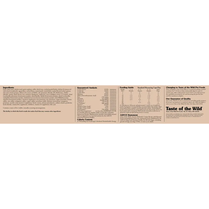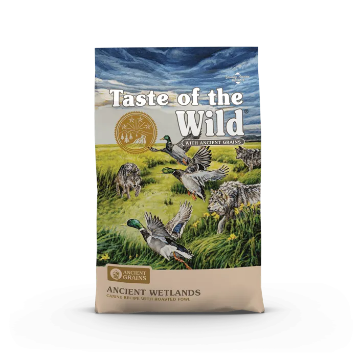 Feed your canine companion a balanced diet with ingredients straight from nature with Taste of the Wild Ancient Wetlands Roasted Fowl & Ancient Grain Recipe Dry Dog Food! It features a tasty trio of real roasted quail, roasted duck and smoked turkey, which not only offers your pup a source of highly digestible protein, but also the wag-worthy flavor he loves. This recipe is crafted with a combination of whole grains like millet, quinoa, chia seed and sorghum to support your sidekick’s overall health and is completely free of corn, wheat, filler and artificial flavors, colors and preservatives!