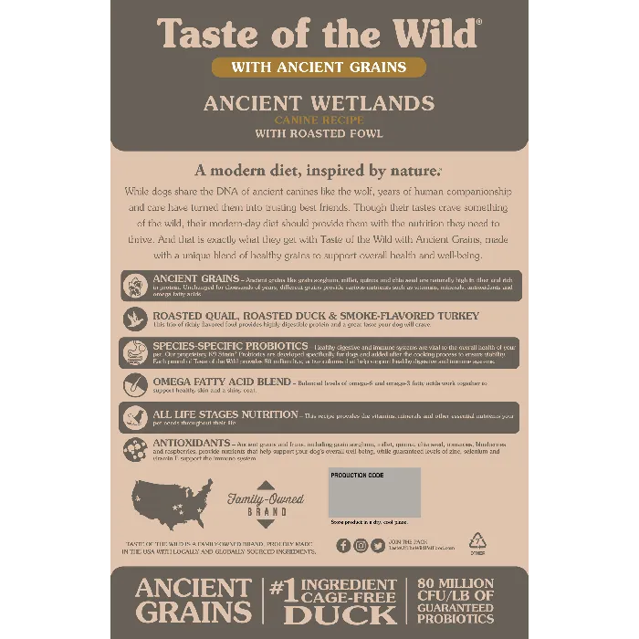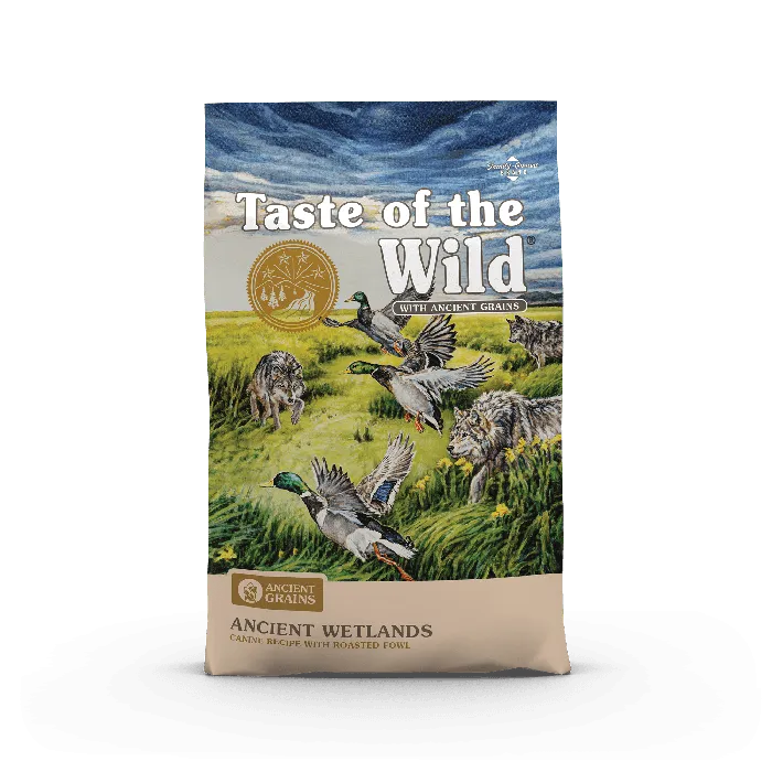 Feed your canine companion a balanced diet with ingredients straight from nature with Taste of the Wild Ancient Wetlands Roasted Fowl & Ancient Grain Recipe Dry Dog Food! It features a tasty trio of real roasted quail, roasted duck and smoked turkey, which not only offers your pup a source of highly digestible protein, but also the wag-worthy flavor he loves. This recipe is crafted with a combination of whole grains like millet, quinoa, chia seed and sorghum to support your sidekick’s overall health and is completely free of corn, wheat, filler and artificial flavors, colors and preservatives!