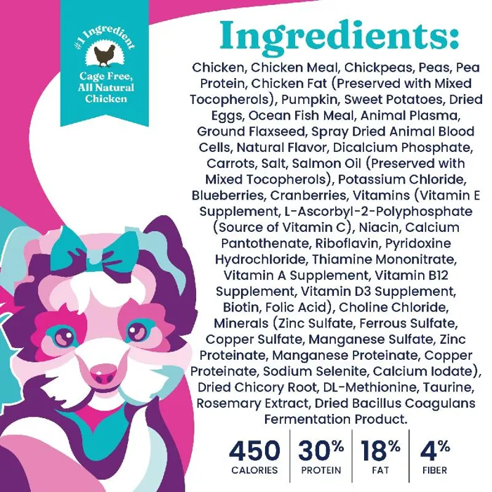 Bison, Ocean Fish Meal, Brown Rice, Peas, Canola Oil (preserved with mixed tocopherols), Oatmeal, Pea Protein, Dried Eggs, Rice Bran, Pearled Barley, Salmon Meal, Tomato Pomace, Natural Flavor, Flaxseed, Salt, Choline Chloride, DL-Methionine, Potassium Chloride, Salmon Oil (preserved with mixed Tocopherols), Taurine, Dried Chicory Root, L-Carnitine, Carrots, Pumpkin, Apples, Cranberries, Blueberries, Broccoli, Parsley, Spearmint, Almond Oil (preserved with mixed Tocopherols), Sesame Oil (preserved with mixed Tocopherols), Yucca Schidigera Extract, Dried Kelp, Thyme, Lentils, Vitamin A Supplement, Vitamin D3 Supplement, Vitamin E Supplement, Zinc Sulfate, Niacin, Ferrous Sulfate, L-Ascorbyl-2-Polyphosphate (Source of Vitamin C), Calcium Pantothenate, Thiamine Mononitrate, Copper Sulfate, Riboflavin, Pyridoxine Hydrochloride, Manganese Sulfate, Zinc Proteinate, Folic Acid, Calcium Iodate, Manganese Proteinate, Copper Proteinate, Sodium Selenite, Biotin, Vitamin B12 Supplement, Rosemary Extract, Dried Lactobacillus Acidophilus Fermentation Product, Dried Enterococcus Faecium Fermentation Product, Dried Lactobacillus Casei Fermentation Product.Guaranteed Analysis