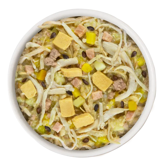 - Featuring boneless, skinless white breast meat chicken with pumpkin, quinoa, egg, sweet potato, and ham