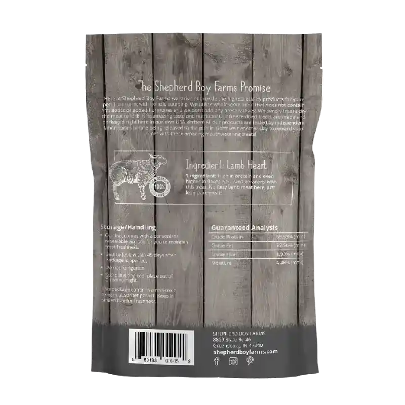 Indulge your furry friend with Shepherd Boy Farms Lamb Hearts Freeze-Dried Dog & Cat Treats, perfect for both kitties and pups. A gentle freeze-drying process preserves the natural characteristics of the product, ensuring the highest quality treat for your furbaby. Sourced and made in the USA, these treats promote overall health and wellness by providing a rich source of iron, B vitamins (B2, B3, B6, and B12), omega-3 fatty acids, and protein. Made from raw, diced lamb heart with no added or removed ingredients, these treats have a strong flavor that your four-legged family member will love.