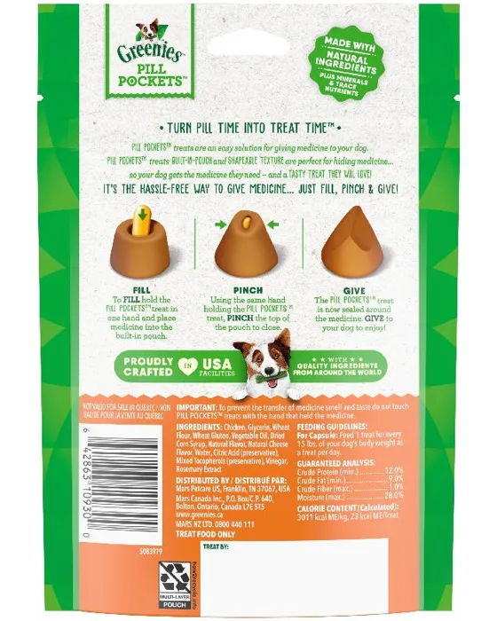 Pets are smart about avoiding their meds, but you're smarter. Designed and recommended by vets, GREENIES(TM) PILL POCKETS Treats for Dogs make it easy to give your dog medicine. Don't hide medicine in human foods, such as peanut butter or cheese. Give a healthy, low-calorie dog treat instead. GREENIES(TM) PILL POCKETS Treats take the stress and mess out of administering tablets or liquid medication to your dog. Our easy-to-use pouches mask the smell and taste of medicine and deliver a real cheese flavor your dog will love.