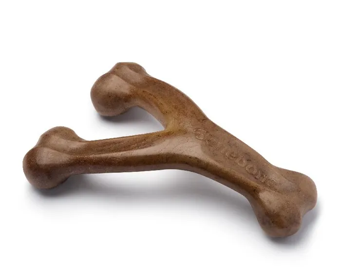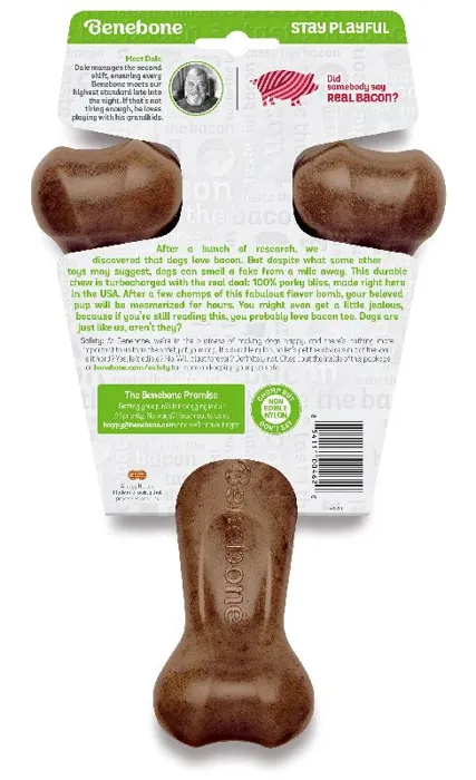 h3. Flavored Wishbone Dog Chew Toy, Made in USAAt Benebone, we started with the premise that dogs experience scent and flavor in a way we can’t even grasp. So, we ditched the neon colors and loud squeaks. Inspired by the dog’s powerful sense of smell, we developed a long-lasting durable chew that’s jam-packed with real flavor. Once your dog takes a bite of our USA-made chews, he’ll be hooked.* **Dog-Friendly Design** – Last time we checked, dogs don’t have thumbs. Our wishbone chew is cleverly designed so your pup can get a good chew going.* **Real Flavor** – We use only 100% real food ingredients for irresistible flavor and scent. We fuse 100% USA-sourced REAL BACON, REAL PEANUTS, or REAL CHICKEN all the way through the chew. Dogs can tell the difference.* **Made in the USA** – We are fully committed to Made in USA, including packaging, tooling, and all material and ingredient sourcing. We proudly manufacture our products in New York.* **Dog Welfare** – We are fully committed to the welfare of dogs through product donations and community involvement.* **Safety First** – Benebones are not edible. Supervise closely and discard/replace when appropriate.**Instructions for Use and Safety Information:*** We use real flavors, including peanuts. Ensure nobody in the household is allergic to any of our tantalizing ingredients.* While recognizing that weight limit is a rough guide, our small products are for dogs under 30 lbs, our medium products are for dogs under 60 lbs, and our large products are for dogs under 90 lbs. Always choose the largest size your dog can handle.