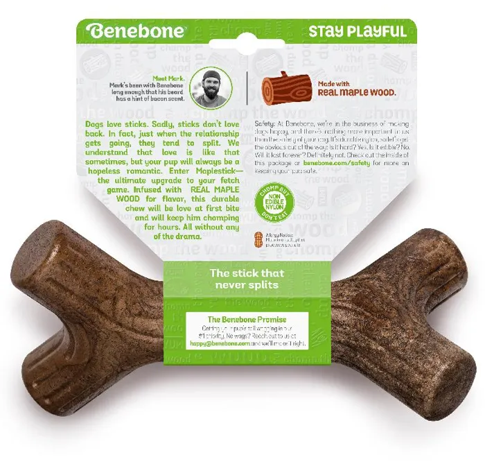 Maplestick Real Wood Durable Dog Chew Toy, Made in USAAt Benebone, we started with the premise that dogs experience scent and flavor in a way we can’t even grasp. So, we ditched the neon colors and loud squeaks. Inspired by the dog’s powerful sense of smell, we developed a long-lasting durable chew that’s jam-packed with real flavor. Once your dog takes a bite of our USA-made chews, he’ll be hooked.• **Dog-Friendly Design** – Last time we checked, dogs don’t have thumbs. Our Maplestick chew is cleverly designed so your pup can get a good chew going. To be honest, we think it’s gorgeous!• **Real Maple Wood** – We use only 100% real flavor in our nylon chew toys. For our wood chew, it’s nothing but 100% USA-sourced nylon and 100% USA-sourced REAL MAPLE WOOD. Did you know the Sugar Maple is New York’s state tree? Every Maplestick is Made in New York.• **Made in the USA** – We are fully committed to Made in USA, including packaging, tooling, and all material and ingredient sourcing.• **Dog Welfare** – We are fully committed to the welfare of dogs through product donations and community involvement.• **Safety First** – Benebones are not edible. Supervise closely and discard/replace when appropriate.**Instructions for Use and Safety Information:**• At Benebone, we’re in the business of making dogs happy, and there’s nothing more important than the safety of your dog. It’s durable nylon, so let’s get the obvious out of the way. Is it hard? Yes. Is it edible? No. Will it last forever? Definitely not. For more details, check out our packaging and our website.• We use real flavors, including peanuts. Ensure nobody in the household is allergic to any of our tantalizing ingredients.While recognizing that weight limit is a rough guide, our small products are for dogs under 30 lbs, our medium products are for dogs under 60 lbs, and our large products are for dogs under 90 lbs. Always choose the largest size your dog can handle.