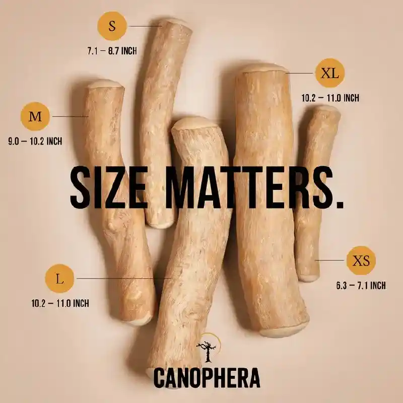 CANOPHERA chew sticks are made from the best materials mother nature has to offer. Coffee wood is an ideal resource for dog chew sticks. It is a lot harder than other wood, which is why our sticks are particularly resilient. And since it is the only ingredient in our CANOPHERA sticks, our products are 100% vegan and free from any harmful additives. Additionally, we don’t harm the environment in our production process. Since coffee wood is a natural byproduct during coffee production, no tree is uprooted or cut down just for us. To ensure there is a chew for all dogs, our sticks come in several sizes. CANOPHERA sticks come in Extra Small through Extra Large and are suitable for adult dogs and puppies 6 months and up. XS: for dogs up to 10 lbs / 5 kg S: for dogs up to 20 lbs / 10 kg M: for dogs up to 45 lbs / 20 kg L: for dogs up to 85 lbs / 40 kg XL: for dogs 85 lbs and up The CANOPHERA chew stick for dogs offers constant activity and playfully supports dental care. The chew stick strengthens the dental muscles and promotes the natural cleaning of teeth. The fine wood fibers serve as a toothbrush. The chew sticks are made out of coffee tree wood. They don’t contain any traces of animal or artificial ingredients, calories, caffeine or sugar. They are also suitable for dogs that have allergies or are overweight. Fine wood fibers come off from these chew sticks. In small amounts, the dog can swallow and digest these small flakes without any problem. If larger pieces come off, please discard. Always monitor your pet while chewing. We recommend one 20-minute chew session a day with our chews, as this is about the time a dog reaches their ideal relaxed state.
