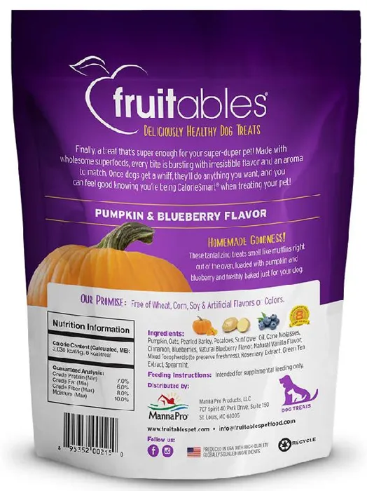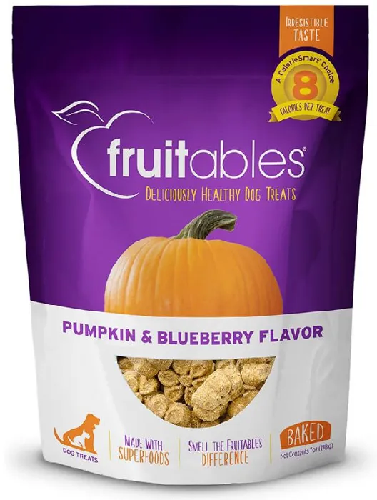 Open a bag of Fruitables treats and you will immediately smell the difference. At Fruitables, they make treats that taste as good as they smell. Fresh from the ovens in their certified organic bakery, this mouthwatering recipe will remind you of a pumpkin muffin packed with warm blueberries freshly baked into a delicious crunchy treat. With less than 9 calories each, these treats are the perfect guilt-free indulgence for your lovable dog. Fruitables treats come in different textures and a variety of flavors as broad as the rainbow - go ahead, explore the deliciously healthy world of Fruitables!