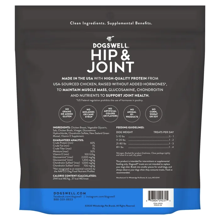 Reward your dog with the chunky, meaty flavor he craves with a little something extra inside. The Hip & Joint jerky treats from Dogswell are made with real chicken, for a treat that satisfies more than just his taste buds. That's because each flavorful bite helps to maintain his lean muscle mass with high-quality protein. How's that for a pick-me-up? With an additional boost from glucosamine, and chondroitin, these tasty jerky treats may even promote healthy joint function, too! So, while he's chomping on authentic, USA-made jerky, you can bask in the knowledge that his new favorite chew is a healthy, grain-free snack you trust. It's everything your dog has ever wanted, with everything you expect from a pet-loving company like Dogswell.