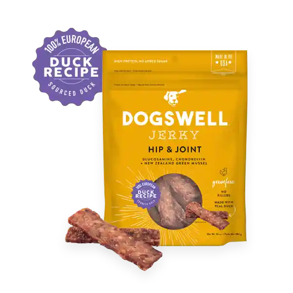 Reward your dog with the chunky, meaty flavor he craves with a little something extra inside. The Hip & Joint jerky treats from Dogswell are made with real duck, for a treat that satisfies more than just his taste buds. That's because each flavorful bite helps to maintain his lean muscle mass with high-quality protein. How's that for a pick-me-up? With an additional boost from glucosamine, chondroitin and New Zealand green mussel, these tasty jerky treats may even promote healthy joint function, too! So, while he's chomping on authentic, USA-made jerky, you can bask in the knowledge that his new favorite chew is a healthy, grain-free snack you trust. It's everything your dog has ever wanted, with everything you expect from a pet-loving company like Dogswell.