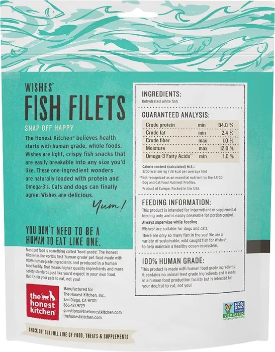 The Honest Kitchen Wishes Dehydrated White Fish Filets Dog & Cat Treats make anytime a reason for snack time! Light, crispy, and easy to snap into pieces, you can use them whole or break off morsels for smaller mouths. Dogs and cats both love the taste, so they're an easy solution for multi-pet homes. And with a single ingredient of wild-caught fish, they're loaded with protein and good-for-them omega-3 fatty acids. Finally, dogs and cats have something to agree on - so everyone's wish has been granted!