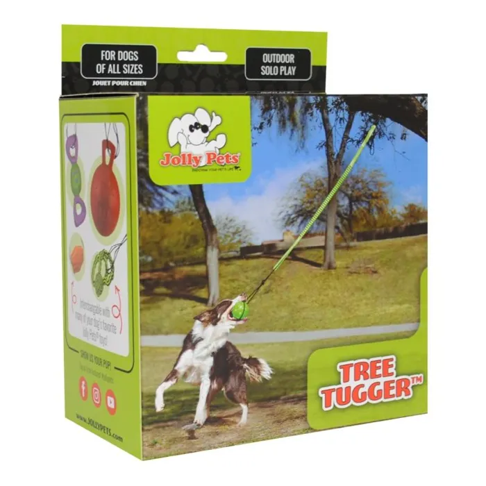 Meet your dog’s new best friend for solo play time! Toss this interactive bungee over a tree limb or second story deck and watch them jump, hurl, and tug the Jolly Pets Tree Tugger™ for hours! The Tree Tugger™ perfectly simulates a game of tug-o-war for any size dog by using the included Jolly Jumper™ toy or attaching your pup’s favorite toy. The Jolly Pets Tree Tugger™ is great for heavy chewers because you can adjust the height so your pup can’t sit and chew on the toy constantly.