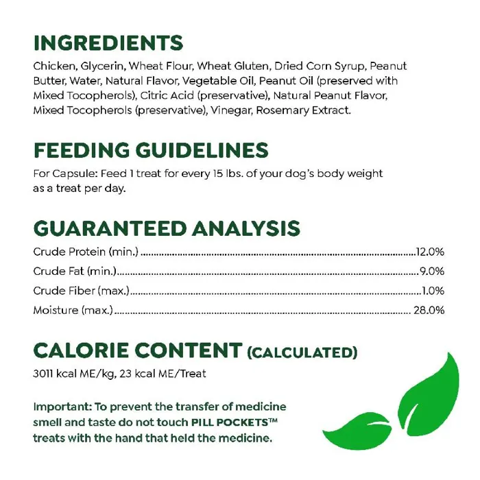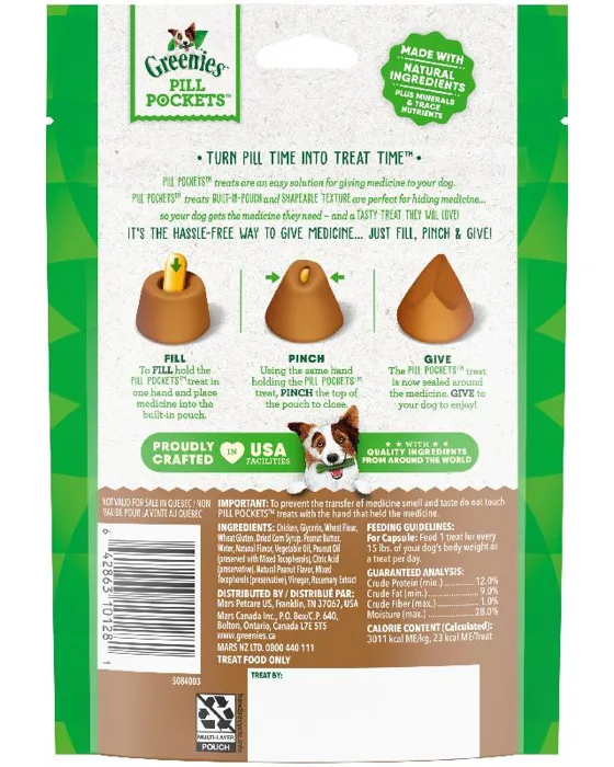 Giving your pup medication no longer has to be a hassle! Greenies Pill Pockets Canine Peanut Butter Dog Treats are the perfect, low calorie way to disguise pills and eliminate the stress of giving your furry companion medicine. Greenies Pill Pockets Canine Peanut Butter Dog Treats mask both the smell and taste of the pills put inside!