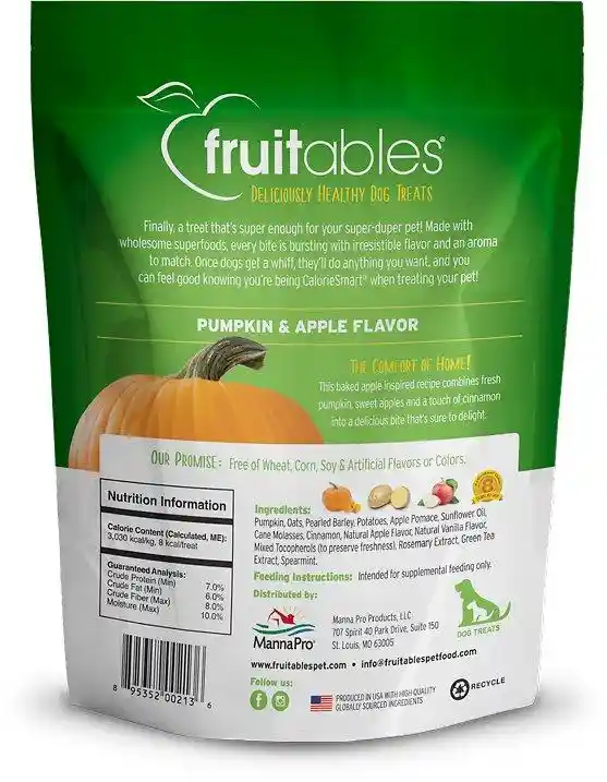 Open a bag of Fruitables treats and you will immediately smell the difference. At Fruitables, they make treats that taste as good as they smell. Fresh from the ovens in their certified organic bakery, this "baked apples" inspired recipe combines the flavors of fresh pumpkin, sweet apples, and a touch of cinnamon into a delicious crunchy treat. With less than 9 calories each, these treats are the perfect guilt-free indulgence for your lovable dog. Fruitables treats come in different textures and a variety of flavors as broad as the rainbow - go ahead, explore the deliciously healthy world of Fruitables!