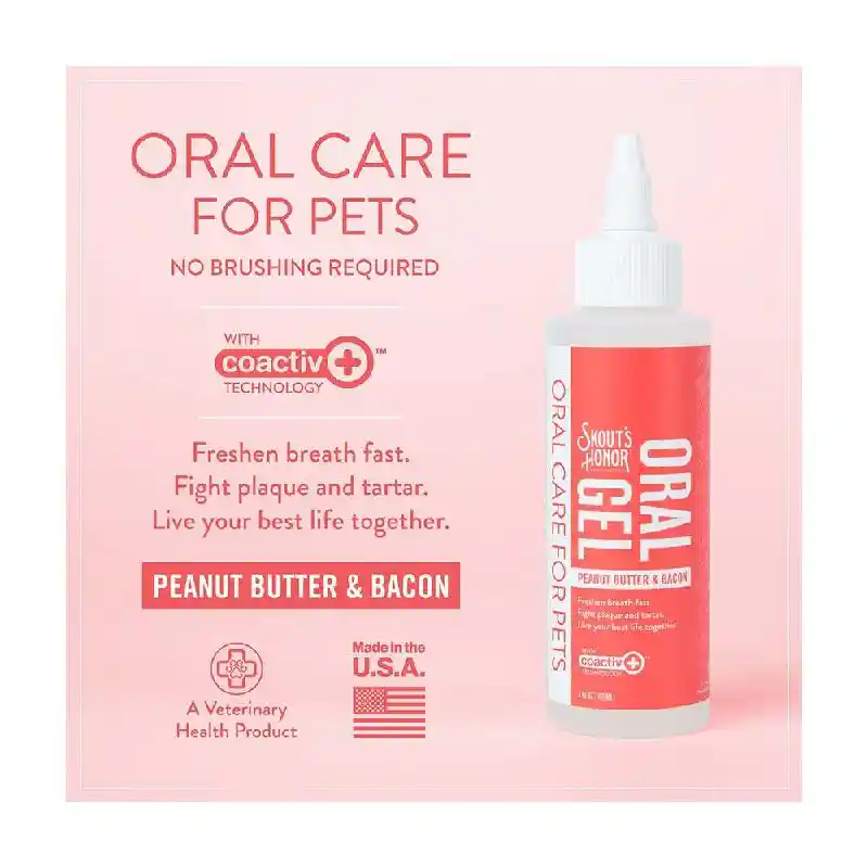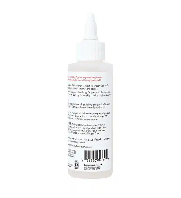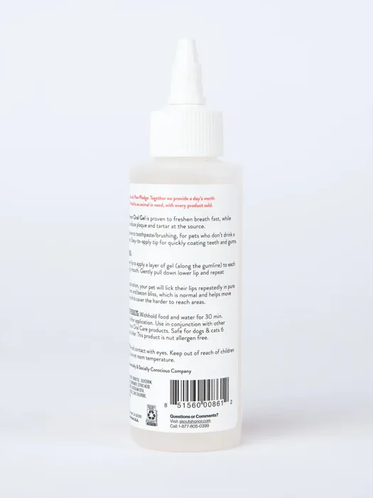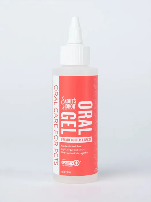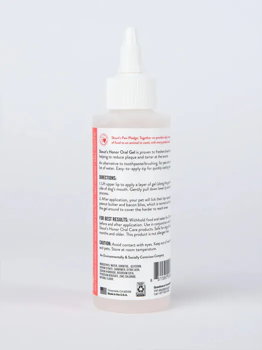 Skout’s Honor Oral Gel is proven to freshen breath fast, while helping to reduce plaque and tartar at the source. A tasty alternative to toothpaste/brushing, for pets who don't drink a lot of water, but who love peanut butter and bacon. Easy-to-apply tip for quickly coating teeth and gums.Skout's Paw Pledge: Together we provide a day's worth of food to an animal in need, with every product sold (Buy a Bottle, Feed an Animal).