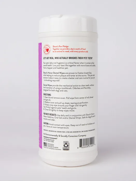 Skout's Honor Dental Wipes are proven to freshen breath fast, while helping to reduce plaque and tartar at the source. This pet-safe solution makes it easy to create a better oral care routine for your pet - no brushing required! Skout's Paw Pledge: Together we provide a day's worth of food to an animal in need, with every product sold (Buy a Bottle, Feed an Animal).