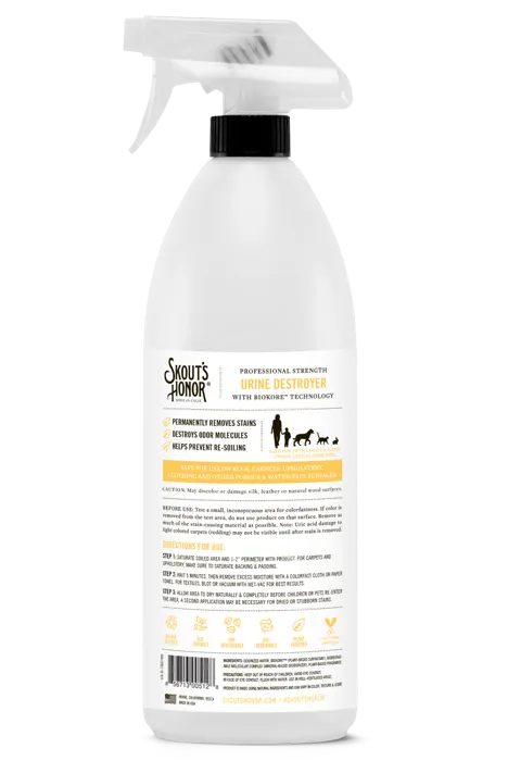 Keep your home clean with Skout's Honor Professional Strength Urine Destroyer. This hard-working spray performs fast to break down and eliminate both old and new pet urine stains and odors at the molecular level. This eco-friendly spray is safe for use on rugs, carpets, upholstery and clothing for a versatile but strong cleanser. The BioKore technology breaks down the stain while the odor eliminating technology destroys those pungent molecules for a fresh clean scent. Together, these eco-friendly solutions will keep your home unstained and ready for the next slip-up.