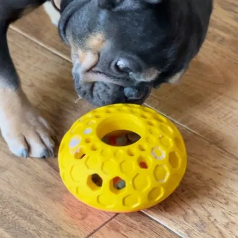 The Natural Rubber Bee Hive Reward Dog Toy is crafted from rugged and flexible natural rubber, providing a stimulating mental and physical playtime for your furry friend. Your pup can lick and nudge the toy to their heart's content while being rewarded with treats that shake out as they play. The inner retention sleeve helps keep all the treats from pouring out of the top when flipped over. This toy is perfect for dogs who enjoy a fun challenge and can easily be cleaned in the dishwasher's top rack after use.