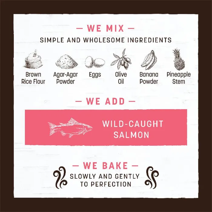 Ingredients - Salmon, Vegetable Gelatin, Brown Rice Flour, Organic Eggs, Olive Oil, Banana, Bromelain (Pineapple)
