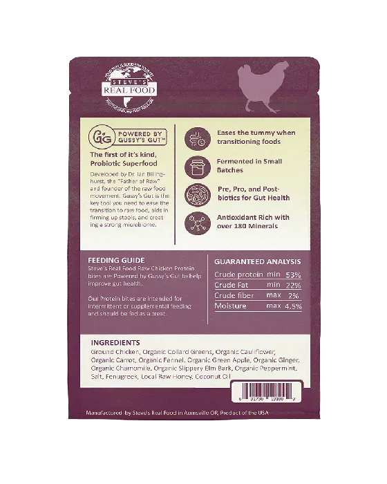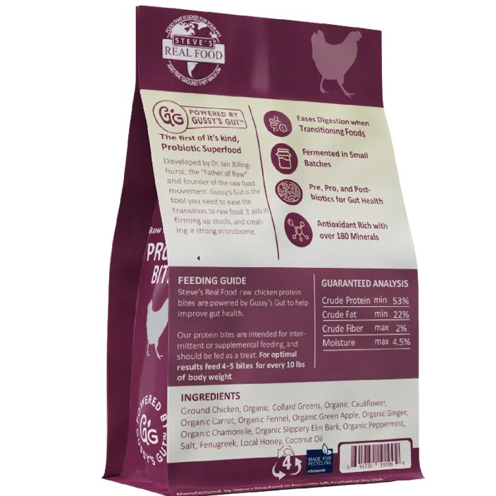 Steve’s Real Food Protein Bites are healthy treats for dogs and cats. These fermented bite-sized treats are powered by Gussy’s Gut organic fermented superfood blend. Crafted to enhance gut health in dogs and cats, our Protein Bites are available in convenient 4 oz bags, offering a delectable choice between lamb and chicken flavors. Protein Bites are a freeze-dried treat for dogs and cats. This product is powered by Gussy’s Gut organic fermented superfood blend.