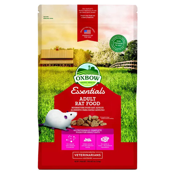 Our Adult Rat Food is formulated to meet the specific nutritional needs of adult rats. This complete and balanced rat food is low in fat and includes exact levels of key nutrients to support daily function and performance. The uniformity of Essentials - Adult Rat prevents the selective feeding commonly associated with mixes and seed-based diets. Uniform kibble prevents selective feeding. Low fat formula supports daily function and performance. Fortified with vitamins and minerals for optimum health. Formulated with the guidance of top veterinarians and nutritionists.